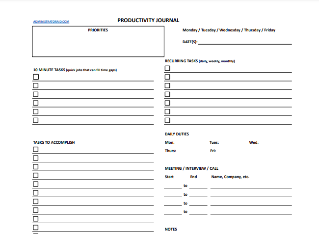 Administrative support, organization tips, time management strategies, and business process optimization.